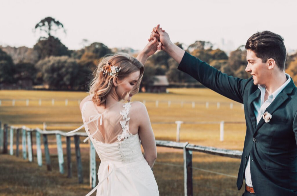 From the beginning, the mood is set with a soft, cinematic glow. A beautiful couple shares joyful moments, dancing together with ease and laughter, surrounded by the peaceful calm of the open landscape. The bride stuns in a flowing lace gown, her look completed with a handmade dried flower hair accessory that adds a delicate, natural touch to her effortless style.